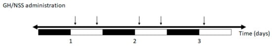 The rats in each group were treated with either GH or NSS for 3 days (short-term administration). The arrows indicate GH or NSS administration (0800h and 1600h). The black and white bars show dark and light phases, respectively (12 h/12 h).
