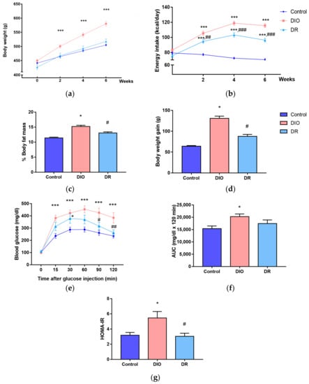 DIO rats were characterized by higher BW, BW gain, and body fat mass, while DR rats presented parameters comparable to control rats. Glucose intolerance was found in DIO rats and related to impaired insulin sensitivity as the greater HOMA-IR.