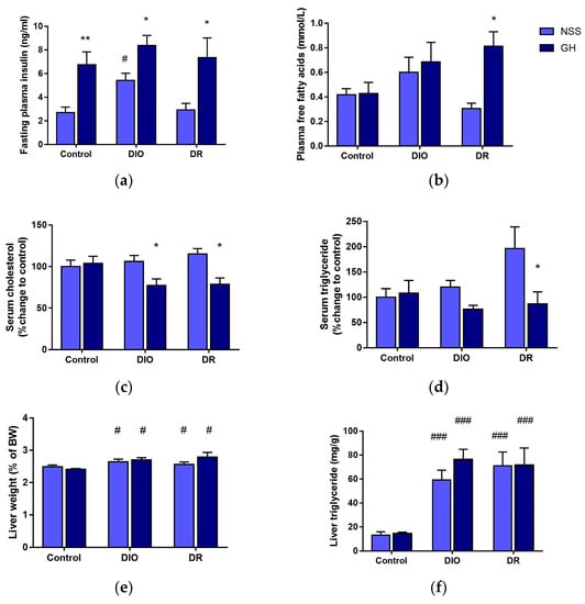 (a) Plasma insulin after short-term GH administration; *, ** represent statistical significance between GH and NSS groups (p < 0.05, p < 0.01, respectively), # represents statistical significance when compared to the control group (p < 0.05). (b) Plasma free fatty acids after short-term GH administration; * represents statistical significance between GH and NSS groups (p < 0.05). (c) Serum cholesterol levels (% change to the control group) after short-term GH treatment; * represents statistical significance between GH and NSS groups (p < 0.05). (d) Serum triglyceride levels (% change to the control group) after short-term GH treatment; * represents statistical significance between GH and NSS groups (p < 0.05). (e) The percentage of liver weight in each group; # represents statistical significance when compared to the control group (p < 0.05). (f) Liver triglyceride concentration (mg/g tissue) in each group; ### represents statistical significance when compared to the control group (p < 0.001). All results are presented as mean ± SEM; n = 6 per experimental group (NSS/GH of control and DIO rats), n = 5 per experimental group (NSS/GH of DR rats).