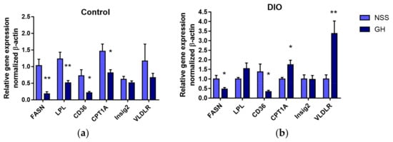 To investigate whether short-term GH administration could affect hepatic lipid metabolism, the diet-induced obesity (DIO) rat model was used. Consuming a hypercaloric diet induces obesity and NAFLD, which subsequently decreases GH levels and insulin resistance [,,]. Lipid accumulation in the liver has been found after feeding with a hypercaloric diet [,,,]. Feeding rats with a high-fat diet decreased circulating GH levels and the downstream effectors of the hepatic GH signaling pathway, including signal transducer and activator of transcription-5 (STAT-5) and Janus kinase-2 (JAK2) []. Hepatic JAK2 deletion mice develop a fatty liver that is associated with an elevated level of CD36 gene expression []. GHR also plays an important role in liver lipid metabolism. Increased hepatic lipid uptake, increased hepatic de novo lipogenesis, and severe insulin resistance were observed in the livers of GHR knockout mice []. In addition, increased hepatic triglyceride content was found in the GHR antagonist transgenic mouse model []. Thus, the regulation of GHR may affect the severity of NAFLD.