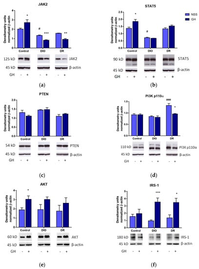 In NSS-treated groups, the JAK2 protein levels in the liver of DIO rats were significantly lower than those of control and DR rats (p < 0.05) (Figure 6a). Short-term GH treatment significantly increased JAK2 protein levels in the liver of control rats (p < 0.05). In contrast, JAK2 protein expression in the liver of DIO and DR rats was significantly decreased by short-term administration of GH (p < 0.001 and p < 0.01, respectively). The protein content of STAT5 in DIO rats was significantly lower than that of control and DR rats (p < 0.05) (Figure 6b), similar to the trend for JAK2. However, short-term GH administration markedly increased the level of STAT5 only in control rats (p < 0.05). There was no difference in the amount of PTEN in the liver of DIO or DR rats when compared to control rats. Interestingly, the concentration of PTEN in DIO rats was significantly higher than in DR rats (p < 0.05). GH treatment did not affect the level of PTEN in any groups (Figure 6c). DR rats had significantly higher levels of PI3K p110α protein than control and DIO rats (p < 0.001) (Figure 6d). Decreased PI3K p110α levels were only observed in DR rats after short-term GH treatment (p < 0.05) (Figure 6d). Short-term GH administration significantly increased AKT level in control rats (p < 0.05) (Figure 6e), although a similar trend was seen in DIO and DR rats but did not reach statistical significance. IRS-1 protein levels were increased in short-term GH-treated DIO and DR rats (p < 0.001 and p < 0.05, respectively) (Figure 6f); however, IRS-1 levels were unchanged by GH treatment in control rats.