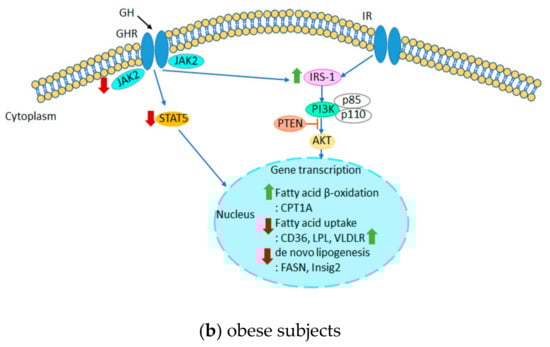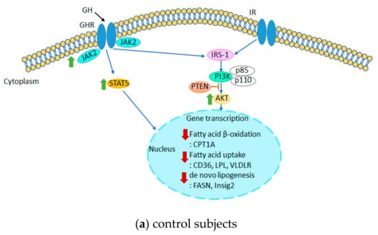 Physical inactivity and eating a hypercaloric diet are the primary causes of weight gain, eventually leading to obesity []. Imbalances in energy status that occur in conjunction with obesity, including insulin resistance and fat accumulation in the liver, contribute to the development of NAFLD. In addition, the elevation of hepatic triglycerides (TG) is one of the hallmarks of NAFLD [,] and increased lipogenesis has been reported in NAFLD patients []. The imbalance of the genes involved in lipid synthesis and disposal leads to the progression of NAFLD []. To maintain physiologic conditions, it is crucial to regulate the transcription of genes involved in liver lipid synthesis and storage, including fatty acid synthase (FASN), acetyl-CoA carboxylase (ACC), and cluster of differentiation 36 (CD36), and the genes involved in lipid disposals such as carnitine palmitoyltransferase 1A (CPT1A) and the very low-density lipoprotein receptor (VLDLR). Hepatic lipogenesis is regulated by hormonal and nutritional status with GH and insulin reported to regulate hepatic gene transcription [,]. Hepatic CD36 mRNA expression was higher in GH receptor (GHR) knockout mice and liver-specific GHR knockout mice, which was linked to higher levels of hepatic TG accumulation [,]. Additionally, hepatic FASN mRNA expression was greater in liver-GHR knockdown mice compared to control mice after fasting and refeeding. These findings confirmed the importance of hepatic GHR in liver lipid metabolism, especially in de novo lipogenesis []. Insulin is involved in hepatic lipogenesis by upregulating the expression of FASN mRNA in diabetic and transgenic mice []. Insulin resistance is common in patients with NAFLD [], and it has been established that insulin resistance is one of the major pathological factors in disease progression []. Reduced GH levels may contribute to the advancement of NAFLD, although the roles of GH in lipid metabolism are complex. Short-term GH supplements may reduce hepatic insulin resistance by improving liver lipid metabolism.