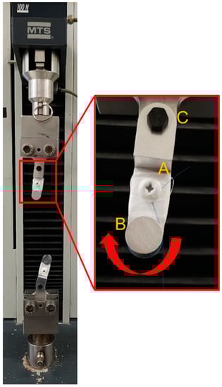 Details of the designed grips. The threads are mounted on the grips as described: a surgical knot is done around the screw (A), and the suture thread is passed one time around the cylinder (B). Finally, the grips are separated until the suture thread is tight. The right self-alignment of the thread is guaranteed by the bearing placed in (C) allowing free rotation of the grip.