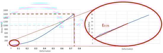 Stress–deformation curve with ultimate tensile strength (UTS) and Young’s modulus at the 0–3% range of deformation (E0–3).