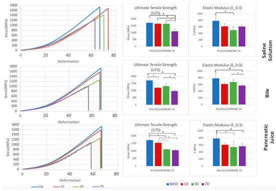 Comparison of stress–deformation curves of Poliglecaprone 25 incubated in saline solution, bile, and pancreatic juice at different time steps (left). Corresponding UTS and E0–3 (right). * p < 0.05.