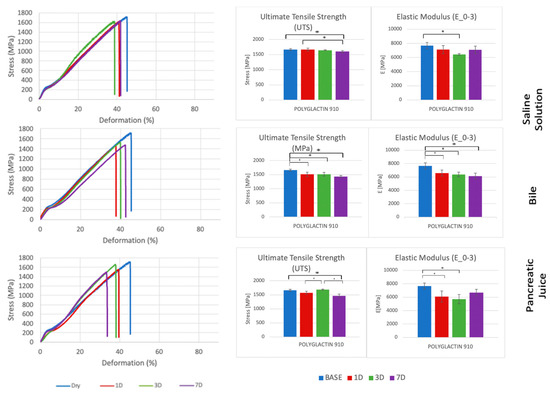 Comparison of stress-deformation curves of Polyglactin 910 incubated in saline solution, bile, and pancreatic juice at different time steps (left). Corresponding UTS and E0–3 (right). * p < 0.05.