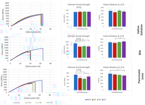 Comparison of stress–deformation curves of Polypropylene incubated in saline solution, bile, and pancreatic juice at different time steps (left). Corresponding UTS and E0–3 (right). * p < 0.05.
