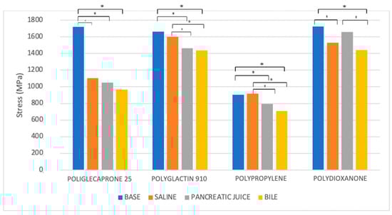 Comparison of the ultimate tensile strength (UTS) of different suture threads after 7 days of incubation in saline solution, bile, and pancreatic juice. * p < 0.05.