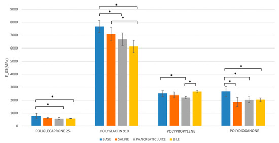 Comparison of the Young’s modulus at the 0–3% range of deformation (E0–3) of different suture threads after 7 days of incubation in saline solution, bile, and pancreatic juice. * p < 0.05.