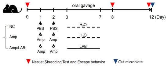 As shown in Table 1, after the behavior recovery rate was assessed during the first stage test, the seven-week-old male C57BL/6J mice (n = 36) were randomly assigned to 4 groups by body weight. In the NC group (n = 9) and Amp group (n = 10), mice were orally administered PBS or 100 mg/kg/day Amp, respectively, once per day from the 1st day until the 2nd day. After Amp treatment, mice were orally administered an equal volume of Milli-Q water (NC and Amp groups) or a strain composite (A1, A4, and A5) and were fed a dose of 1.6 × 108 CFU/mouse (low dosage, LABL) (n = 12) or 4.8 × 108 CFU/mouse (high dosage, LABH) (n = 12) from the 3rd day until the 7th day as experimental groups. Four groups were assessed for depressive behavioral changes on the initial (0), 8th and 12th days. Then, all mice were sacrificed with carbon dioxide on the 12th day. The ileum, cecum, and descending colon were removed, weighed, and inspected prior to pathological, biochemical, and gut microbiota analysis.