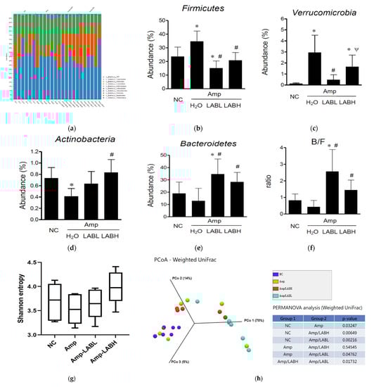 The intestinal samples obtained from 6 mice in 4 groups were used for 16S rRNA analysis of intestinal bacteria. According to the OTU heatmap, the changes in the phyla OTUs (Figure 3a) represented the average change in the intestinal flora of C57BL/6J mice. In the Amp group, the abundance of Firmicutes and Verrucomicrobia increased, but the abundance of Actinobacteria significantly decreased (p < 0.05) (Figure 3b–d). In contrast, in the LABL and LABH groups, there was a decrease in Firmicutes abundance, but Bacteroidetes abundance was significantly increased (p < 0.05) (Figure 3b,e). The Actinobacteria abundance was significantly higher in the LABH group than in the Amp group (p < 0.05) (Figure 3d). In addition, the Bacteroidetes/Firmicutes (B/F) ratio was significantly higher in the LABL and LABH groups than in the Amp group (p < 0.05) (Figure 3f).