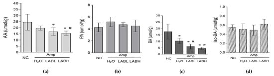 Figure 6 shows the percentages of SCFA in the cecum of C57BL/6J mice. The results showed that the most important fatty acid was acetic acid, and the joint second most important were the butyric and propanoic acids; the SCFA with the lowest amount was isobutyric acid in the C57BL/6J mice (Figure 6). In the Amp group, the propanoic acid (PA) level was significantly higher, and butyric acid (BA) was significantly lower than in the NC groups (Figure 6a,b) (p < 0.05). The LABL groups also had significantly higher levels of acetic acid (AA), propanoic acid, and iso-butyric acid (Iso-BA) and significantly lower levels of butyric acid than the NC groups (p < 0.05) (Figure 6). Acetic acid levels were significantly higher, and butyric acid levels were significantly lower in the LABL group than in the Amp groups (Figure 6b,c) (p < 0.05). Additionally, the LABH groups had significantly higher levels of acetic acid, propanoic acid, and isobutyric acid and significantly lower levels of butyric acid than both the NC and Amp groups (Figure 6) (p < 0.05).