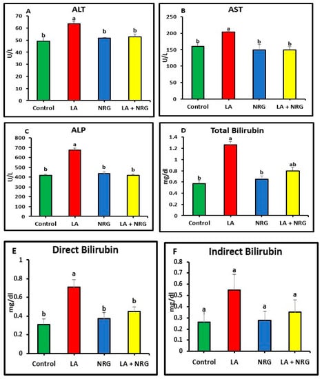 Liver function parameters: (A) AST (U/L), (B) ALT (U/L), (C) ALP (U/L), (D) total (mg/dL), (E) direct bilirubin (mg/dL), and (F) indirect bilirubin (mg/dL) at the 4th week of treatment of LA-intoxicated rats with NRG (mean ± SE)). The means in each chart with different superscripts are significantly different (p < 0.05). ALT: alanine aminotransferase; AST: aspartate aminotransferase; ALP: alkaline phosphatase. a for the high value; while b for the lower value.