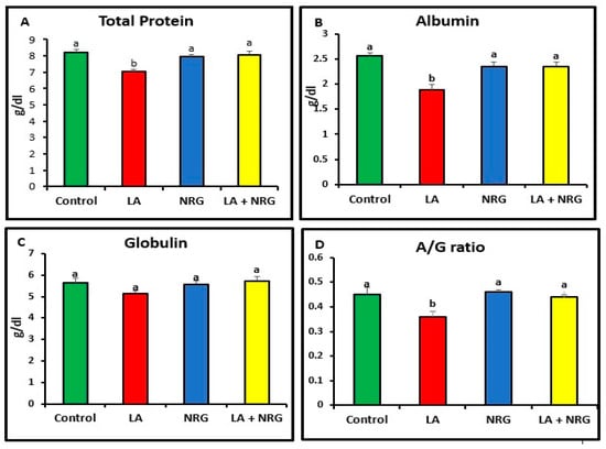 Proteinogram: (A) total protein (g/dL), (B) albumin (g/dL), (C) globulin (g/dL), and (D) A/G ratio at the 4th week of treatment of LA-intoxicated rats with NRG (mean ± SE). The means in each chart with different superscripts are significantly different (p < 0.05). A/G ratio: albumin/globulin ratio. a for the high value; while b for the lower value.