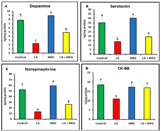 Brain neurotransmitters: (A) dopamine (ng/mg protein), (B) serotonin (ng/mg protein), (C) norepinephrine (pg/mg protein), and (D) CK-BB (U/mg/protein) in the different experimental groups at the 4th week of treatment of LA-intoxicated rats with NRG (mean ± SE). The means in each chart with different superscripts are significantly different (p < 0.05). CK-BB: creatine kinase brain band isoenzyme. a for the high value; b, for intermediate values between a and c; while c for the lower value.