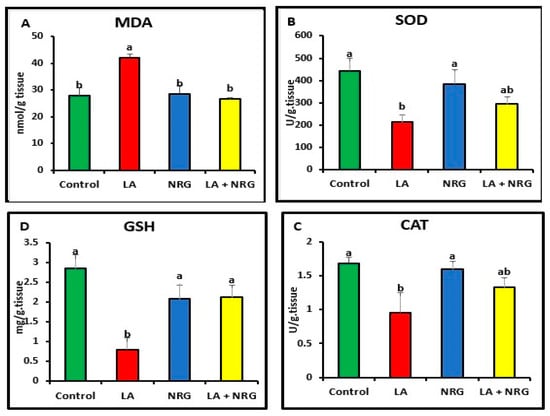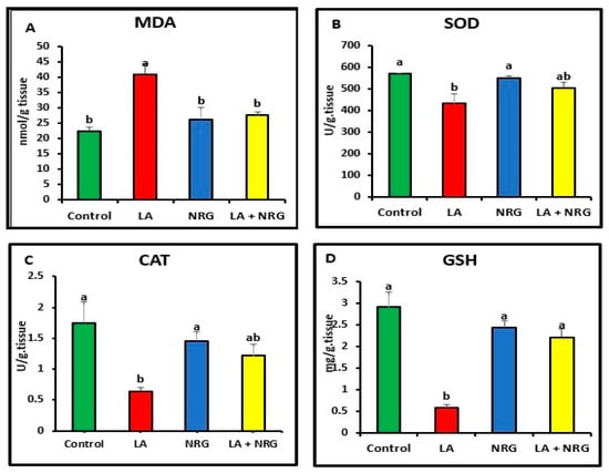 Hepatic oxidative/antioxidative parameters: (A) MDA (nmol/g tissue), (B) SOD (U/g tissue), (C) catalase (U/g tissue), and (D) GSH (mg/g tissue) at the 4th week of treatment of LA-intoxicated rats with NRG (mean ± SE)). The means in each chart with different superscripts are significantly different (p < 0.05). MDA: malondialdehyde; SOD: superoxide dismutase; CAT: catalase; GSH: reduced glutathione. a for the high value; while b for the lower value.