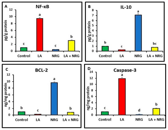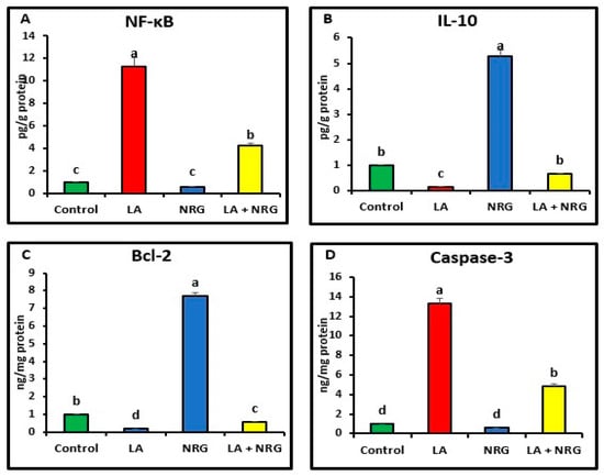 Hepatic pro- and anti-inflammatory mediators: (A) NF-κB (Pg/g protein), (B) IL-10 (Pg/g protein), (C) BCL-2 mRNA expression (ng/mg protein), and (D) caspase-3 mRNA expression (ng/mg protein) in the different experimental groups at the 4th week of treatment of LA-intoxicated rats with NRG (mean ± SE). The means in each chart with different superscripts are significantly different (p < 0.05). NF-κβ: nuclear factor kappa-B; IL-10: interleukin 10; BCL-2: B-cell lymphoma 2; caspase-3: cysteine-aspartic proteases. a for the high value; b, c for intermediate values between a and d, while d for the lower value.