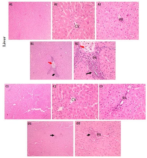 Histopathological examination of liver sections using H&E: (A1–A3) control and (C1–C3) liver sections showing the regular arrangement of hepatic cords around central veins (CVs) with normal portal areas (PAs) and sinusoids (H&E, 100× and 400×). (B1,B2) Liver sections showing portal congestion (red arrows) with massive mononuclear cell infiltration (black arrows) (H&E, 100×). (D1,D2) Liver sections showing mild mononuclear cell infiltration (black arrows) in the portal area (H&E, 400×).