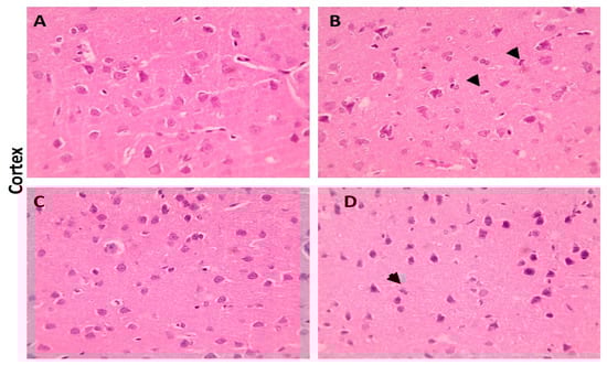 Histopathological examination of cerebral cortical sections using H&E. (A,C) Cerebral cortical section showing normal neurons, glial cells, and neuropil (H&E, 400×). (B) Cerebral cortical sectionshowing shrinkage of some neurons (black arrowheads) (H&E, 400×). (D) Cerebral cortical section showing shrinkage of a few neurons (black arrowheads) (H&E, 400×).