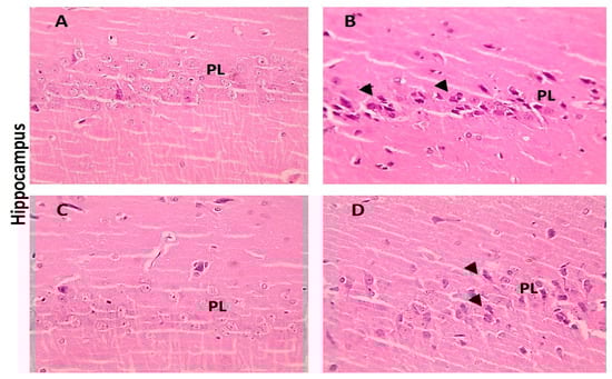 Histopathological examination of hippocampal sections using H&E. (A,C) Hippocampal section showing normal neurons in the pyramidal layer (PL) (H&E, 400×). (B) Hippocampal section showing marked degeneration and shrinkage of neurons in the pyramidal layer (PL) (H&E, 400×). (D) Hippocampal section showing mild degeneration and shrinkage of a few neurons in the pyramidal layer (PL) (black arrowheads) (H&E, 400×). (G) granular cell layer, (P) Purkinje layer and (M) molecular cell layer.