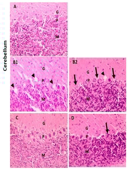 When compared with the cerebral cortex sections of the control group, which displayed normal neurons, glial cells, and neuropil, some of the neurons from the LA group showed shrinkage. However, there were few neurons showing shrinkage in the cerebral cortex portions from the LA + NRG group (Figure 9A–D). Hippocampal sections showed normal neurons in the pyramidal layer (PL) in the control and NRG groups. Hippocampal sections from the LA group showed the marked degeneration and shrinkage of neurons in the pyramidal layer (PL). Hippocampal sections from the LA + NRG group showed mild degeneration and shrinkage of a few neurons in the pyramidal layer (PL) (Figure 10A–D). Cerebellar sections showed normal neurons in the granular (G), Purkinje (P), and molecular (M) cell layers in the control and NRG groups. Cerebellar sections from the LA-intoxicated group showed multiple vacuolations and the prominent loss of neurons in the Purkinje layer. Cerebellar sections from the LA + NRG group showed the mild focal loss of neurons in the Purkinje layer (Figure 11A,B1,B2,C,D).