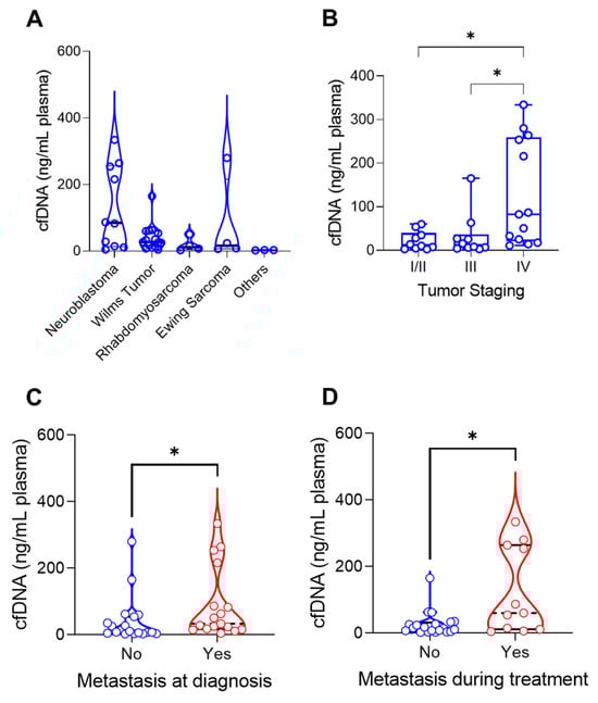 cfDNA levels at diagnosis were evaluated regarding the tumor characteristics. Statistically significant comparison where indicated by “*”. (A): cfDNA ng per mL plasma across tumor histologies (p = 0.0201, Kruskal–Wallis test). (B): cfDNA ng per mL plasma correlated with tumor stage (I/II–IV: p = 0.0227, III–IV: p = 0.0303). (C): Metastatic patients (n = 17) had higher levels of cfDNA at diagnosis compared with nonmetastatic patients (n = 18, p = 0.0153, Mann–Whitney U test). (D): Patients who developed metastasis during treatment (n = 11) also had higher levels of cfDNA compared to those who did not (n = 19, p = 0.0264, Mann–Whitney U test).