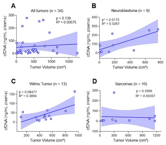 To investigate whether cfDNA had a relation to tumor burden, for all tumors, we compared the tumor characteristics with cfDNA levels. We observed that cfDNA levels were higher in patients with stage IV tumors compared to stages I/II (p = 0.0227) and stage III (p = 0.0303) in patients with metastasis at diagnosis (p = 0.0153) and in those who developed metastasis during treatment (p = 0.0264, Figure 2B–D). Although we did not identify an association with tumor histology, for neuroblastoma, we verified a correlation between cfDNA (ng/mL plasma) and the tumor volume (p = 0.0172; R2 = 0.5267) (Figure 3). For the remaining cases, there was no association between cfDNA levels and clinical characteristics of each tumor type (Table 2).