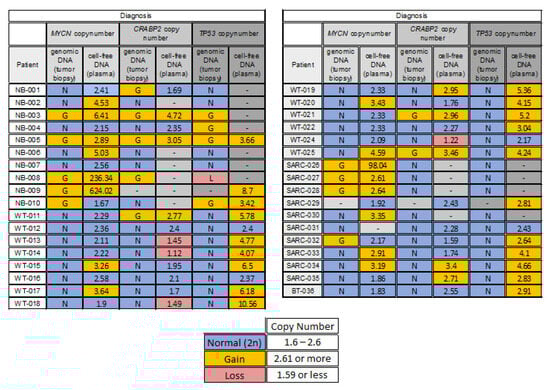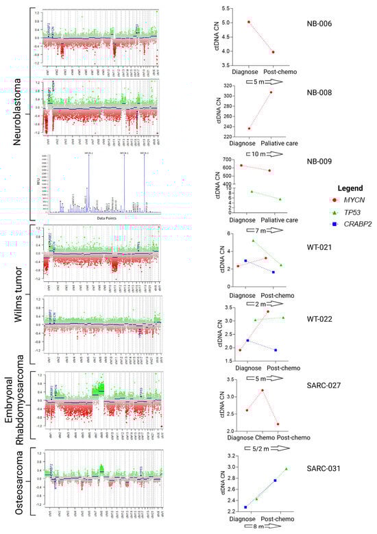 CNAs have been profiled in thousands of tumor samples in virtually all cancer types [9]. In a series of 1699 pediatric tumors, 62% of the alterations were located in a CNA with many of them containing genes associated with cancer [8]. For several cancers, the chromosomal copy number profile of tumor tissue is not only prognostic but also a predictive biomarker of therapeutic response. For Wilms tumors, 1q and MYCN gains, as well as 17p loss, were correlated with a poor outcome [10,11,12,13]. For neuroblastoma, MYCN amplification, 1q gain as well as 1p and 11q deletions were independent predictors of decreased overall survival [14]. Although rare, CNAs have been reported in sarcomas and may be associated with a poor prognosis [15,16]. In particular, MYCN gain was associated with an adverse prognosis in patients with rhabdomyosarcoma [17].
