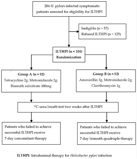 Liu, T.-W.; Chen, Y.-P.; Ho, C.-Y.; Chen, M.-J.; Wang, H.-Y.; Shih, S.-C.; Liou, T.-C. Intraluminal Therapy for Helicobacter pylori Infection—Comparison of Medicament Containing Tetracycline, Metronidazole, and Bismuth versus Amoxicillin, Metronidazole, and Clarithromycin: A Randomized Controlled Study. Biomedicines 2023, 11, 1084. https://doi.org/10.3390/biomedicines11041084
