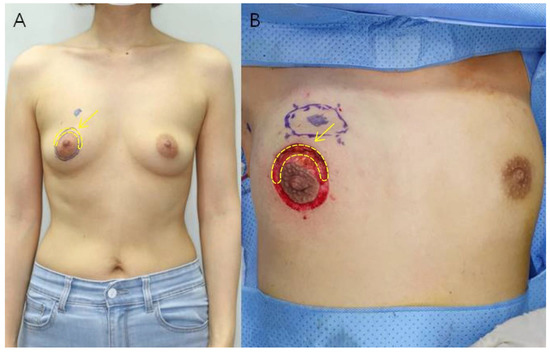 (A) Preoperative photograph of a 46-year-old woman. The tumor is located in the upper inner quadrant of the right breast. After drawing two concentric circles centered on the nipple, a semicircular incision is made along the arc of the breast cancer site to perform breast conservation surgery. (B) Intraoperative photograph after tumor resection. Deep dissection is performed between the two concentric circles and the semicircular part of the breast cancer site is excised. Excess skin was excised to obtain the specimen (yellow arrow).