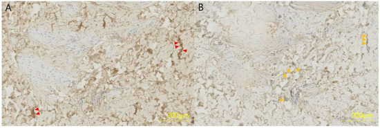 Immunohistochemistry of a full-thickness skin specimen from a 46-year-old woman. (A) Collagen type I and (B) collagen type III were formalin-fixed, paraffin-embedded and stained with a polyclonal antibody at a dilution of 1:100 for 4 h. Collagen type I is stained brown (red arrows) and collagen type III is stained light brown (orange arrows).