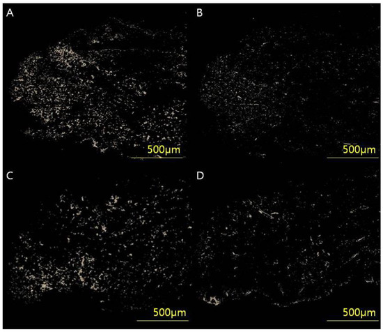 (A,B) Full-thickness skin samples from a 54-year-old woman (VSS 4) who underwent breast-conserving surgery through a periareolar incision were acquired and analyzed using an Axioscan 7 slide scanner and Zen Slide Scan digital image analysis software version 3.4.91 (Carl Zeiss GmbH, Jena, Germany). (C,D) Full-thickness skin samples from a 53-year-old woman (VSS 0). Six random areas (50 × 50 pixels) were captured from each image, and the quantitative areas of collagen type I/III were analyzed using digital image analysis software (Image-Pro Plus, Media Cybernetics, Silver Spring, MD, USA) and custom software to obtain collagen type I/III content and ratio. The analyzed values of (A) collagen type l content, (B) collagen type III content and type I/III ratio were 34.78 μg/g, 11.09 μg/g and 3.13, respectively. The analyzed values of (C) collagen type I content, (D) collagen type III content and type I/III ratio were 13.56 μg/g, 14.96 μg/g and 0.90, respectively.