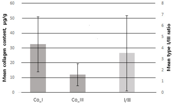 Error bar of SD (standard deviation). Co_I collagen type I (SD = 18.22), Co_III = collagen type III (SD = 6.27) follow the left Y-axis. I/III = collagen type I/III ratio (SD = 3.72) follow the right Y-axis.