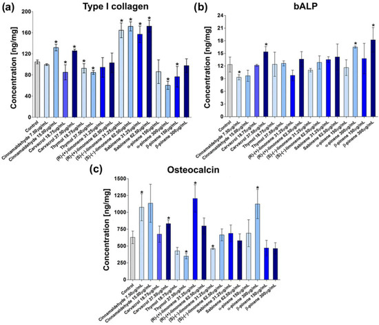 The bone matrix is one of the main components of bone tissue and is mainly built of type I collagen (Col I) (90%) and non-collagenous proteins (10%) such as osteonectin, bone sialoproteins, osteocalcin, and various proteoglycans [52]. According to the studies, bone toughness is mainly determined by the collagen matrix, while bone strength and stiffness depend on the mineral phase. Changes in bone toughness were observed after bone collagen damage using ionizing radiation [53]. Thus, induction of collagen synthesis plays an important role during osteoporosis treatment. In this study, the effect of EO-derived compounds on collagen synthesis by MC3T3-E1 cells after an 8-day culture was studied (Figure 2a). Among all the tested EO-derived compounds, cinnamaldehyde at the concentration of 15 µg/mL, carvacrol at the concentration of 37.50 µg/mL, (S)-(−)-limonene at the concentration of 31.25 µg/mL and 62.50 µg/mL, and sabinene at the concentration of 31.25 µg/mL and 62.50 µg/mL significantly increased type I collagen (Col I) production in MC3T3-E1 cells.