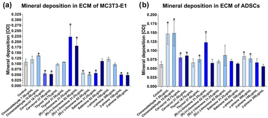 Bone alkaline phosphatase (bALP) is the typical osteogenic marker that promotes mineralization and suppresses osteoclast activity [55]. Osteogenic differentiation may be divided into three main stages, which are characterized by different levels of bALP: (1) proliferation (low bALP activity), (2) ECM synthesis (high bALP activity), and (3) ECM mineralization (moderate bALP activity) [43]. Since bALP is considered an early marker of osteogenic differentiation, in this study, its level was assessed in MC3T3-E1 cells after 8-day exposure to EO-derived compounds (Figure 2b). The performed experiments revealed that MC3T3-E1 cells produced higher amounts of bALP after exposure to carvacrol at the concentration of 37.50 µg/mL and α-pinene and β-pinene at the concentration of 300 µg/mL as compared to the control cells. The obtained results are consistent with the information found in the available literature, which reported a positive impact of α-pinene on bALP synthesis [22,56].