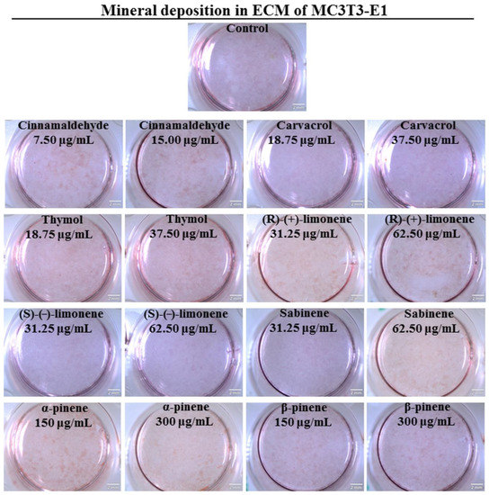 An appropriately mineralized bone ECM is very important for the prevention of osteoporosis since it allows for the maintenance of sufficient bone strength and makes the bone resistant to fracture [57]. Thus, in the next step of the study, ECM mineralization was assessed using MC3T3-E1 preosteoblasts and ADSCs to confirm the obtained results. Quantitative and qualitative evaluations of mineral deposition in the ECM of MC3T3-E1 cells and ADSCs were performed (Figure 3, Figure 4 and Figure 5). In the case of MC3T3-E1 cells, a statistically significant increase in mineral synthesis was observed only after treatment with cinnamaldehyde at the concentration of 15.00 µg/mL and (R)-(+)-limonene at the concentrations of 31.25 and 62.50 µg/mL (Figure 3a). Carvacrol, (S)-(−)-limonene, β-pinene, as well as sabinene at the concentration of 31.25 µg/mL resulted in about a two-fold reduction in the mineral deposition in ECM. Stereoscopic microscope visualization of MC3T3-E1 culture subjected to the treatment with EO-derived compounds after Alizarin Red S staining confirmed quantitative data (Figure 4). Interestingly, unlike MC3T3-E1 cells, ADSCs showed significantly better ECM mineralization after treatment with EO-derived compounds (Figure 3b and Figure 5). Cinnamaldehyde, carvacrol, thymol (only at a concentration of 37.50 µg/mL), (R)-(+)-limonene (only at a concentration of 31.25 µg/mL), and α-pinene significantly stimulated ECM mineralization. Importantly, cinnamaldehyde caused an almost three-fold increase in the mineral deposition in the ECM of ADSCs compared to the control cells. Figure 5 shows images of well-visible mineral deposits in the ECM of ADSCs that were stained with Alizarin Red S solution. It is worth mentioning that in a previous study, it was proven that ADSCs are characterized by a high degree of ECM mineralization [58].