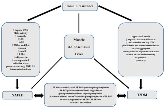 The research reported so far points to IR as a crucial factor linking NAFLD and T2DM, and it is interesting whether IR leads first to NAFLD or T2DM. Smith et al. attempted to answer this question. In their study that gradually decreased insulin sensitivity, insulin secretion gradually increased from the lean group with normal glucose tolerance (NL), to obese NL to obese-NAFLD groups, while total liver insulin extraction was higher in obese-NL and obese-NAFLD individuals than in lean subjects. The presence of insulin in the systemic circulation and extrahepatic insulin extraction gradually increased from the lean NL group to obese NL groups to obese NAFLD groups. Total hepatic insulin extraction remained stable at high insulin delivery rates, and the relationship between systemic insulin appearance and total extrahepatic extraction was linear. This means that the greater increase in plasma insulin concentration in response to oral glucose challenge in overweight and obese individuals with NAFLD compared with those observed in the lean NL group is due to increased insulin secretion rather than to a reduction in total insulin extraction by the liver or extrahepatic tissues. In obese NL and obese NAFLD, hyperinsulinemia after glucose intake is caused by an increase in insulin secretion, without a decrease in overall hepatic or extrahepatic insulin extraction. However, the maximum ability of the liver to remove insulin is limited due to the saturable extraction process. The above implies that it is impossible to compensate for the increase in IR, leading to the impaired glucose homeostasis by increased insulin supply to the liver and extrahepatic tissues in obese individuals with NAFLD [].