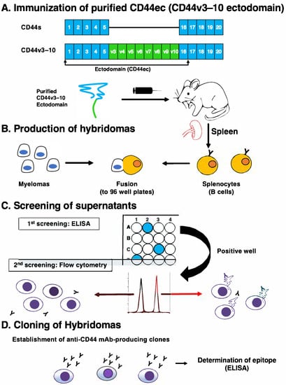 A schematic illustration of anti-human CD44 mAb production. (A) Purified CD44v3–10 ectodomain was intraperitoneally injected into BALB/c mouse. (B) Hybridomas were produced by fusion of the splenocytes and P3U1 cells. (C) The screening was performed by enzyme-linked immunosorbent assay (ELISA) and flow cytometry using parental CHO-K1 and CHO/CD44v3–10cells. (D) After cloning and additional screening, a clone C44Mab-34 (IgG1, kappa) was established. Furthermore, the binding epitopes were determined by ELISA using peptides, which cover the extracellular domain of CD44v3–10.