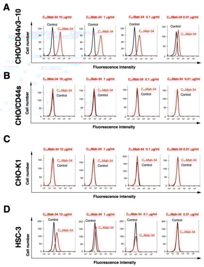 We next determined the binding affinity of C44Mab-34 with CHO/CD44v3–10 and HSC-3 using flow cytometry. The KD of CHO/CD44v3–10 and HSC-3 was 1.4 × 10−9 and 3.2 × 10−9 M, respectively. These results indicate that C44Mab-34 possesses a moderate affinity for CD44v3–10-expressing cells (Figure 3).