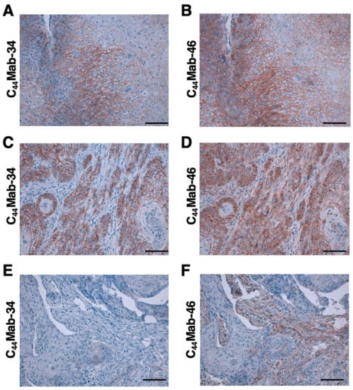 Immunohistochemical analysis using C44Mab-34 and C44Mab-46 against OSCC tissues. After antigen retrieval, serial sections of OSCC tissue array (Catalog number: OR601c) were incubated with 10 µg/mL of C44Mab-34 (A, C, E) or 1 µg/mL of C44Mab-46 (B, D, F), followed by treatment with the Envision+ kit. The chromogenic reaction was conducted using 3,3′-diaminobenzidine tetrahydrochloride (DAB). The counterstaining was performed using hematoxylin. Scale bar = 100 µm.
