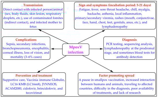 The zoonotic monkeypox disease (Mpox) is caused by the Mpox virus (MpoxV), which is an enveloped double-stranded DNA virus of the poxiviridae family and the genus Orthopoxvirus (OPV) [1,2,3]. The first case of Mpox was identified in 1958 in monkeys, whereas the first case in humans was reported in 1970 [3]. Mpox is a close relative of smallpox disease caused by another OPV called variola virus [2]. Smallpox was eradicated in the early 1980s, but cases of Mpox have been consistently reported as endemic in African nations. This is because smallpox has humans as the only host, while Mpox has humans and many animals as hosts, making it difficult to eradicate. The mode of transmission, symptoms, diagnosis, and complications of Mpox is depicted in Figure 1 [4,5,6,7,8].