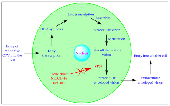 The replication cycle of an OPV involves various steps (Figure 2). The inhibitors of the different stages of the replication cycle of OPVs have been reported [10,19,21]. Tecovirimat and NIOCH-14 are VP37PIs. A combination of tecovirimat/NIOCH-14 and the drugs affecting the various stages of the replication cycle of OPVs, including DNA ligase inhibitor (mitoxantrone), topoisomerase inhibitors (ofloxacin, enrofloxacin, and novobiocin), DNA polymerase inhibitors (cidofovir and brincidofovir), Tyr/ser protein phosphatase inhibitor (ethacrynic acid), late-transcription elongation factor inhibitor (methisazone), early viral transcription inhibitors (adenosine N1-oxide and nigericin), egress inhibitors (terameprocol and imatinib), and rifampicin may produce better therapeutic outcomes for Mpox treatment. Idoxuridine, trifluridine, vidarabine, fialuridine, and adefovir have also displayed anti-OPV activity. The combination of these drugs can also be assessed with tecovirimat and NIOCH-14. The assessment of the synergistic effects of some common anti-Mpox natural remedies (garlic, Nigella sativa oil, moringa oil, and olive oil) and immunity boosters (vitamin C, zinc, thymoquinone, quercetin, ginseng, etc.) is also recommended [61]. However, attention must also be paid to drug–drug interactions (chemical and pharmacological) while developing new combinations of existing VP37PIs with other drugs.