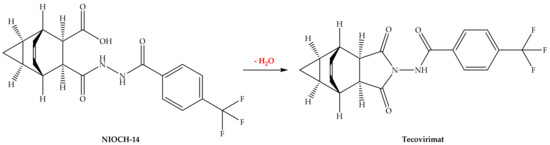 NIOCH-14, a water-insoluble tricyclo-dicarboxylic acid derivative, is a prodrug of tecovirimat. NIOCH-14 is cyclized in the human body to provide tecovirimat as the active metabolite (Figure 4) [40].