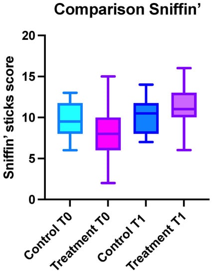 The average Sniffin’ score at the baseline (T0) was 8.2 ± 2.7 (CI95%: 2–15) in the patients assigned to the treatment group and 9.6 ± 2.4 (CI95%: 8–13) in the control. The difference between the two groups at the T0 was not statistically significant (p > 0.05).