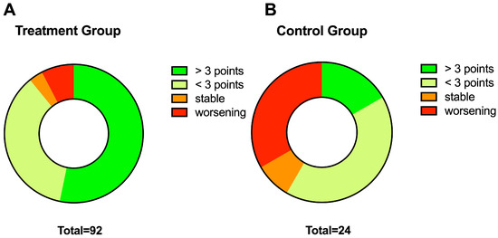 49 patients (52.1%) in the treatment (average 11.4 ± 2.5, CI95%: 8–16) and 6 (18.2%) in the control (average 10.5 ± 0.7; CI95% 10–11) recovered more than 3 points at T1. 33 (35.1%) in the treatment (average 10.6 ± 1.7, CI95%: 8–13) and 15 (45.4%) (average 11.2 ± 2.4, CI95%: 8–14) in the control recovered less than 3 points. 3 patients (3.2%) in the treatment group did not change they score comparing T0 and T1 (average 12.6 ± 0.6, CI95%: 12–13), while in the control group three subjects (9.1%). Finally, we observed 7 patients (7.4%) in the treatment group that worsened their Sniffin’ score comparing T0 and T1 (average 10.6 ± 2.5, CI95%: 6–14) and 12 (36.4%) in the control presented the same concern (average 8.5 ± 2.4, CI95%: 7–12). The differences between treatment and control in term of recovery were statistically significant (c: p = 0.0008) (Figure 2A,B).