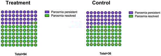 The totality of the patients in both groups had associated parosmia before the treatment. After treatment 58 patients (61.7%) in the treatment group and 21 (58.3%) in the control resolved the parosmia. The difference was not statistically significant (χ: p = 0.3) between treatment and control at T1 (Figure 3).