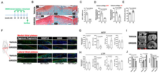 3.4. GRGDS Treatment Prevents Cartilage Degeneration and Subchondral Bone Mineralization