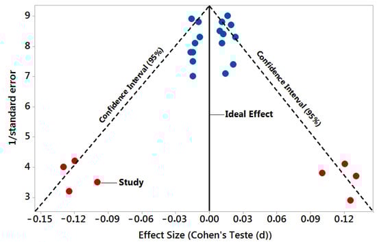 Figure 1 presents the results of the risk of bias of the studies through the Funnel Plot, showing the calculation of the Effect Size (magnitude of the difference) using the Cohen Test (d). This graph presented a symmetrical behavior, not suggesting a significant risk of bias, both among studies with a small sample size (lower precision, with a total of eight (8) studies), which are shown at the base of the graph (red balls), and studies with a high sample size, with a total of 17 studies, which are presented in the upper region of Figure 1.