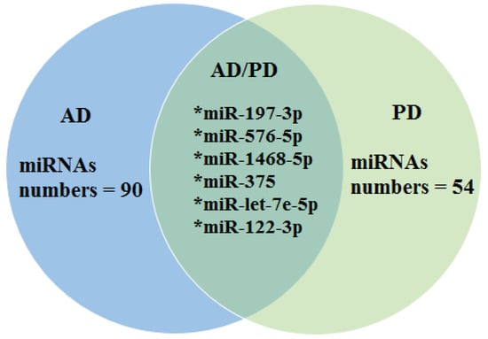Number and types of miRNAs found at the intersection between Alzheimer’s disease (AD) and Parkinson’s disease (PD). * Common microRNAs in AD and PD (intersection).