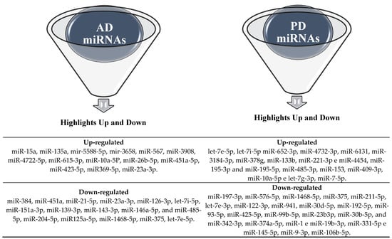 After identifying the most scientifically reliable miRNAs of the selected studies through the accuracy (%) or precision analysis, as shown in Table 5 and Table 7, the main miRNAs for AD and PD were listed in up- and downregulation, respectively, as shown in Figure 3.